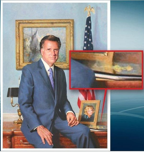 That thing next to his leg in his Gov portrait is Romneycare. He insisted on it being there since it was his proudest moment in office.