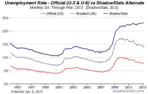 John Williams' ShadowStats charts the real unemployment rate by employing the methods the U.S. government used to use, before they became a political liability.